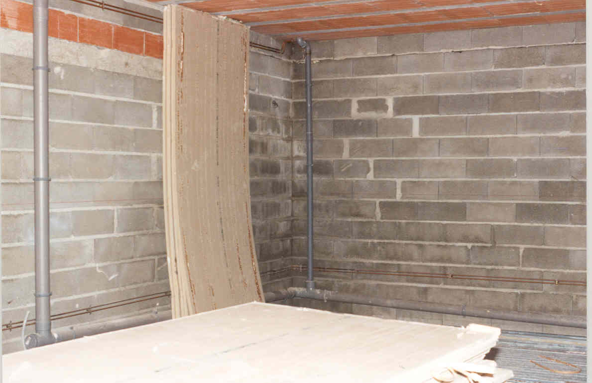 Ma salle d'écoute est située en sous-sol. Sa hauteur est de 2.8 m, sa longueur de 8.85 m et sa largeur de 4.80 m. Les murs de soutènement sont doublés avec des blocs de béton cellulaire de 10 cm d'épaisseur placés devant 100 mm de polystyrène extrudé. Le plafond est doublé par des plaques de plâtres BA13 avec 100 mm de laine de verre. Les isolants assurent à la fois l'isolation thermique et phonique. Le sol est formé d'une dalle en béton désolidarisée des murs recouvert d'un parquet posé sur une sous-couche résiliante de 5 mm d'épaisseur.