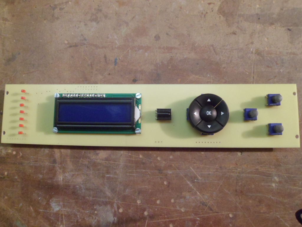 Le LCD est fixé au plus prés du circuit imprimés. On utilise pour cela des entretoise en nylons dont on lime la hauteur pour que les pates de fixation de l'afficheur sur son circuit touche la face avant du boitier. Les boutons sont surélevés de 2mm à l'aide d'une cale en bois. Ceci a pour objet de mettre l'écran du LCD et les boutons de contrôle à la hauteur qui convient par rapport à la face avant du boitier.