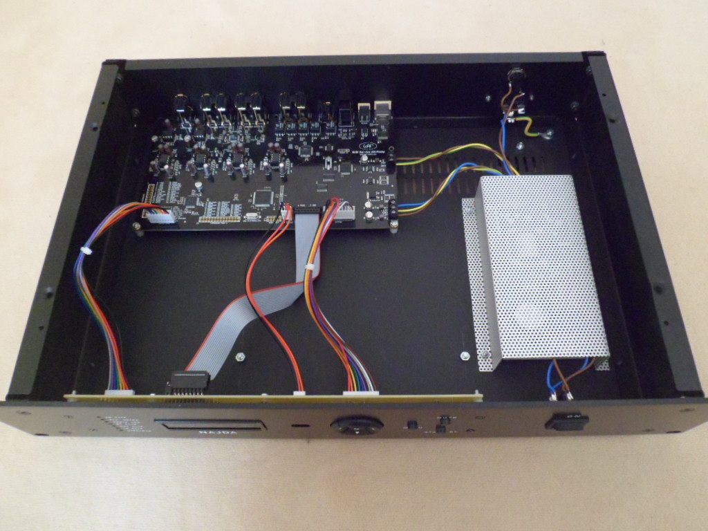 Il est important de marquer le moins possible les faces durant le perçage. La face avant est percée du coté intérieur au boitier et on la pose sur des chiffons pour la protéger. On enlève tous les copeaux avant chaque nouveau perçage. Il est pratiquement impossible de ne pas légèrement rayer les faces. Pour un rendu impeccable, on ponce la face avant avec une ponceuse vibrante jusqu'à faire apparaître l'aluminium. On peint alors avec une bombe de peinture noir mate. La face arrière n'est pas poncée mais juste peinte.